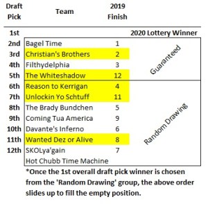 The Draft Lottery will take place some time in the next few weeks. Based on last season’s results, the following draft order is in place pre-lottery for the overall #1 draft pick. Once the overall #1 draft pick is chosen from the ‘random drawing’ group, the order resets to fill the empty position.
