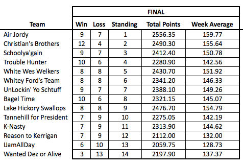 Yes, this is a TL3 blog post. Rare sighting this season, I know. Truth is, your league biographer has been completely consumed with a new gig and dropped anchor during the busiest time of the year. That combined with a lot of personal travel kept yours truly off the laptop. To top it off, there has been an enormous amount of turmoil in the league this year related to injuries and the impact thereof, leaving us languishing and wearied in winds of uncertainty. The league standings reeling to and fro like grain fields swaying in the breeze; so heavy upon them the disappointment of their ever-changing rosters. An injury plagued season does not bode well for a 14-team league – something that was insufficiently considered with the re-expansion this season.